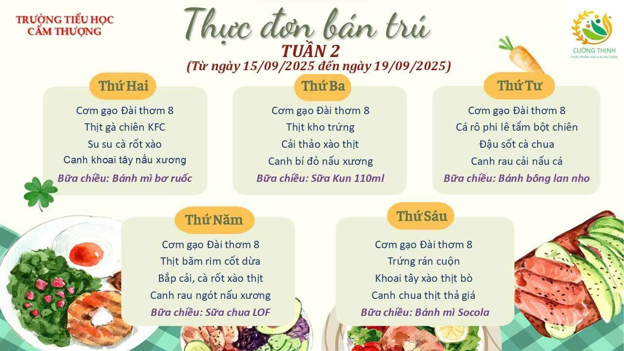THỰC ĐƠN BÁN TRÚ TUẦN 2, NĂM HỌC 2025-2026 ( Từ ngày 15/9/2025 đến ngày 19/9/2025)